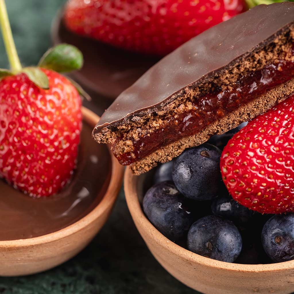 Disfruta de alfajores artesanales sin TACC con el equilibrio justo entre chocolate, frutos del bosque y dulce de leche, una combinación pensada para sorprender desde el primer bocado hasta el último.