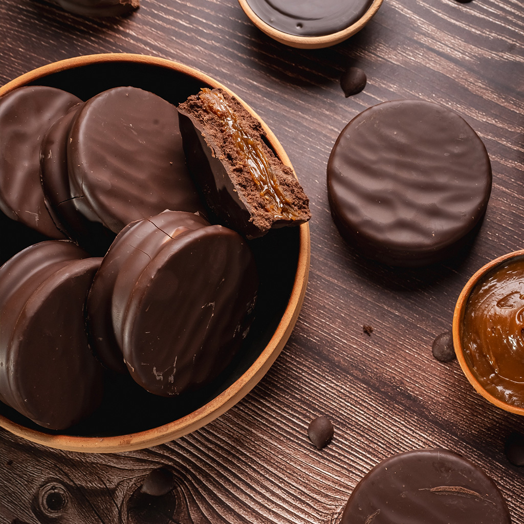 Los alfajores artesanales surtidos de dulce de leche, fruta y chocolate son una propuesta pensada para quienes disfrutan la variedad y los sabores tradicionales en una sola caja. Esta selección combina rellenos clásicos y frutales con distintas coberturas, logrando un equilibrio perfecto entre dulzura, frescura y notas intensas de chocolate. Son perfectos para acompañar el café o el té, sumar variedad a una mesa dulce o elegir como regalo dulce con sabores que gustan a todos. Su presentación variada los convierte en una opción práctica y tentadora para tener en casa o sorprender en cualquier ocasión. Disfruta una selección de alfajores de dulce de leche, fruta y chocolate que reúne lo mejor de los sabores clásicos en una sola experiencia dulce.