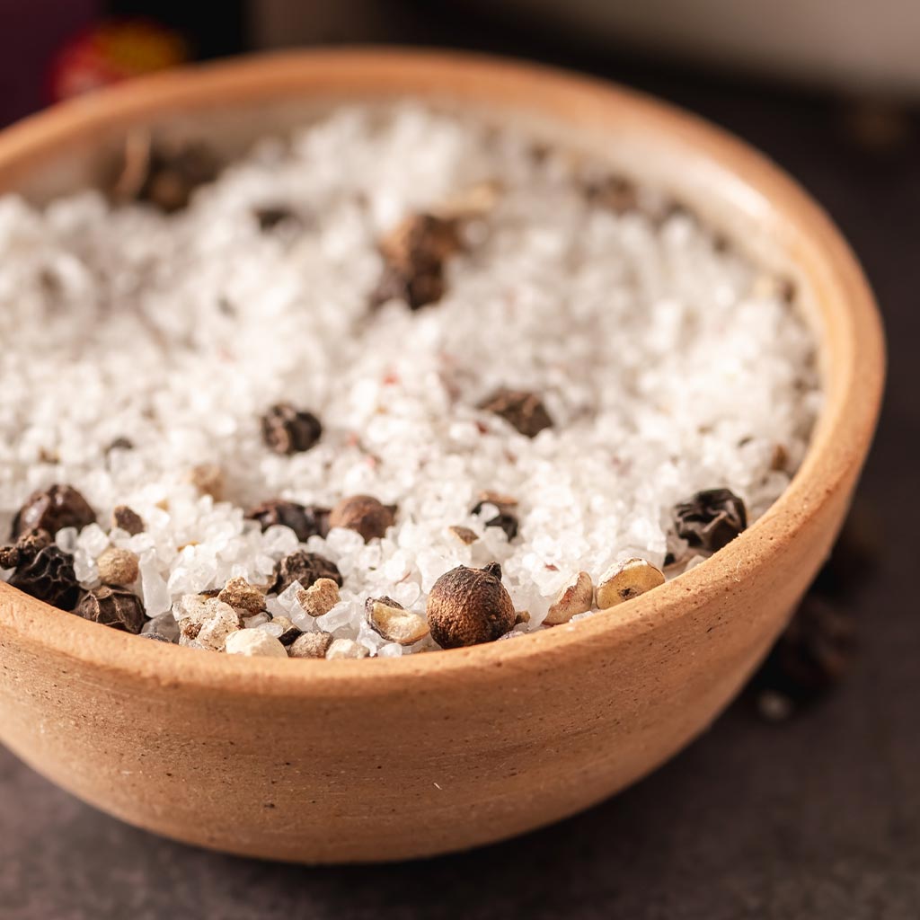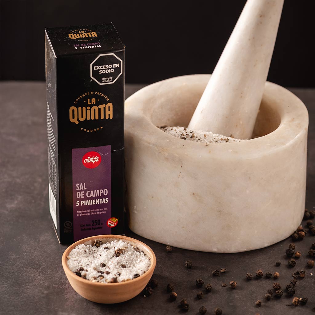 Sal de Campo 5 Pimientas Natural, un blend aromático y equilibrado que combina sal con cinco variedades de pimienta para aportar sabor intenso y un toque especiado a carnes, pastas, verduras y todo tipo de preparaciones gourmet.